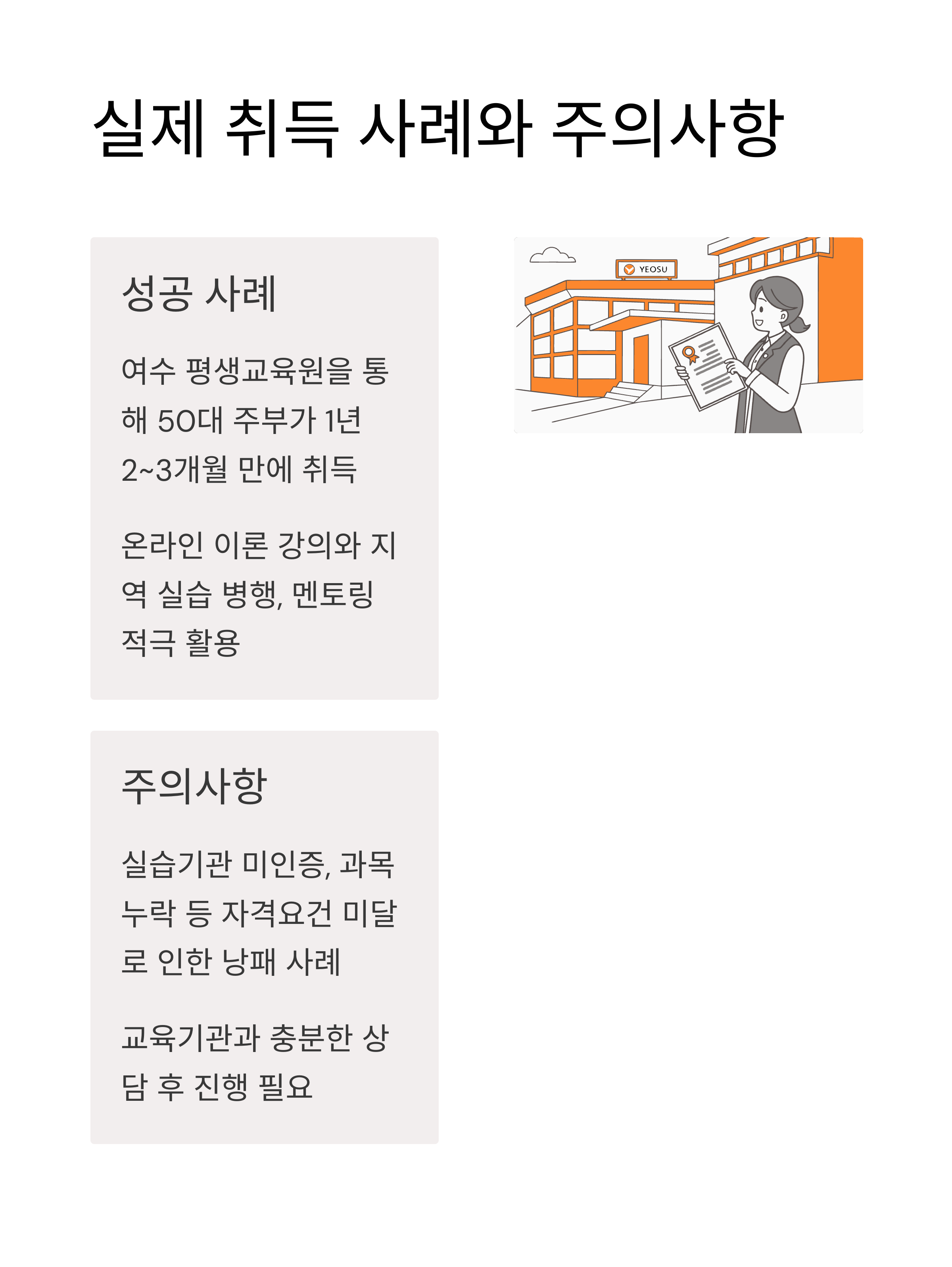 여수 평생교육원을 통해 50대 주부가 1년 2~3개월 만에 취득한 사례가 있습니다.