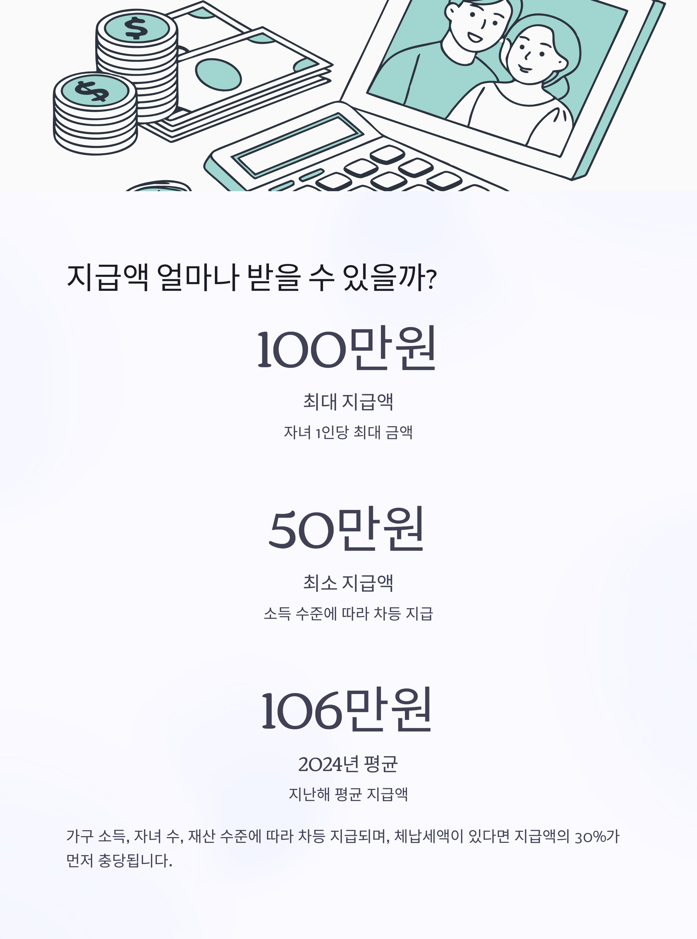 가구 소득, 자녀 수, 재산 수준에 따라 차등 지급됩니다.