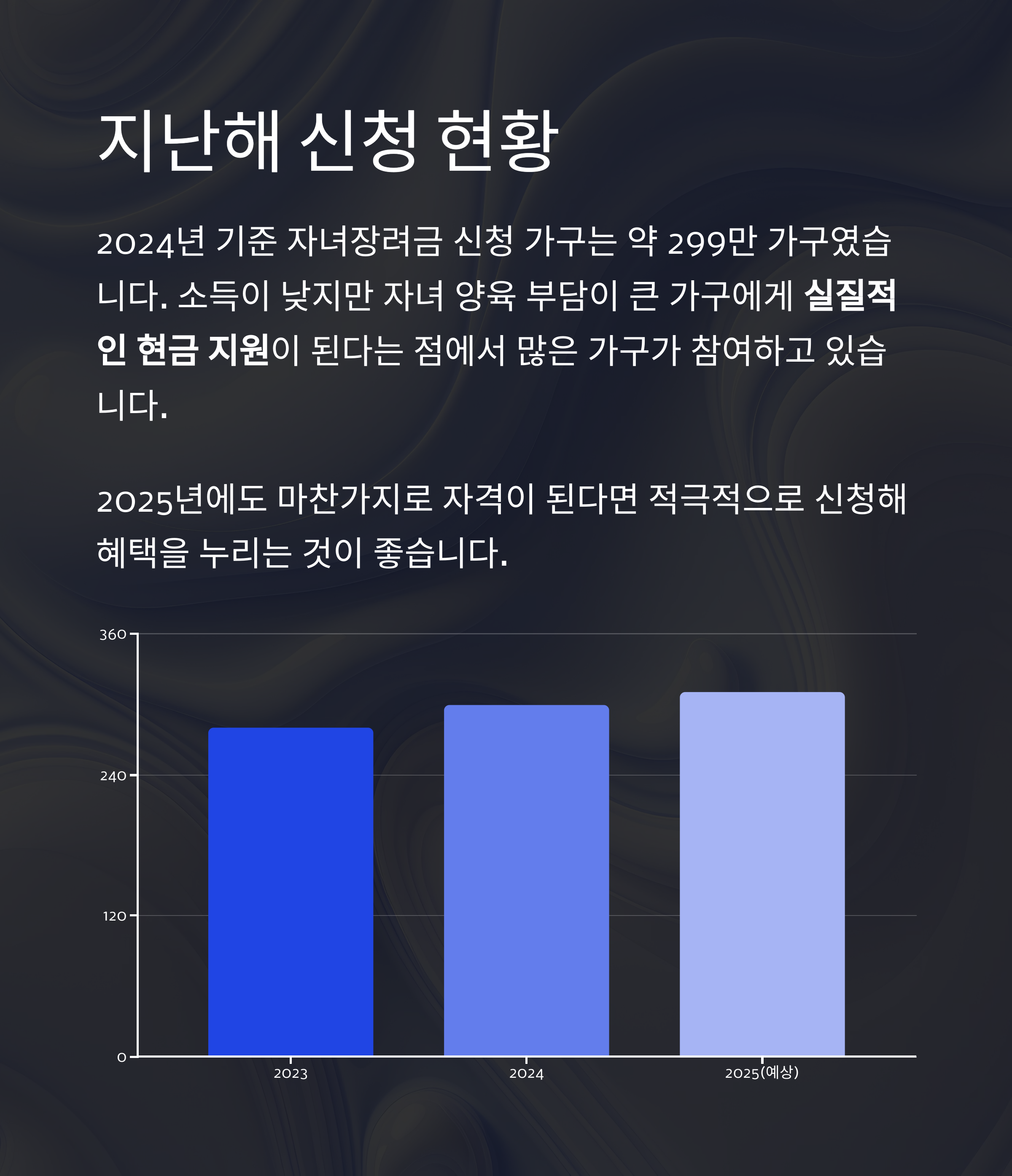 2024년 기준 자녀장려금 신청 가구는 약 299만 가구였습니다.