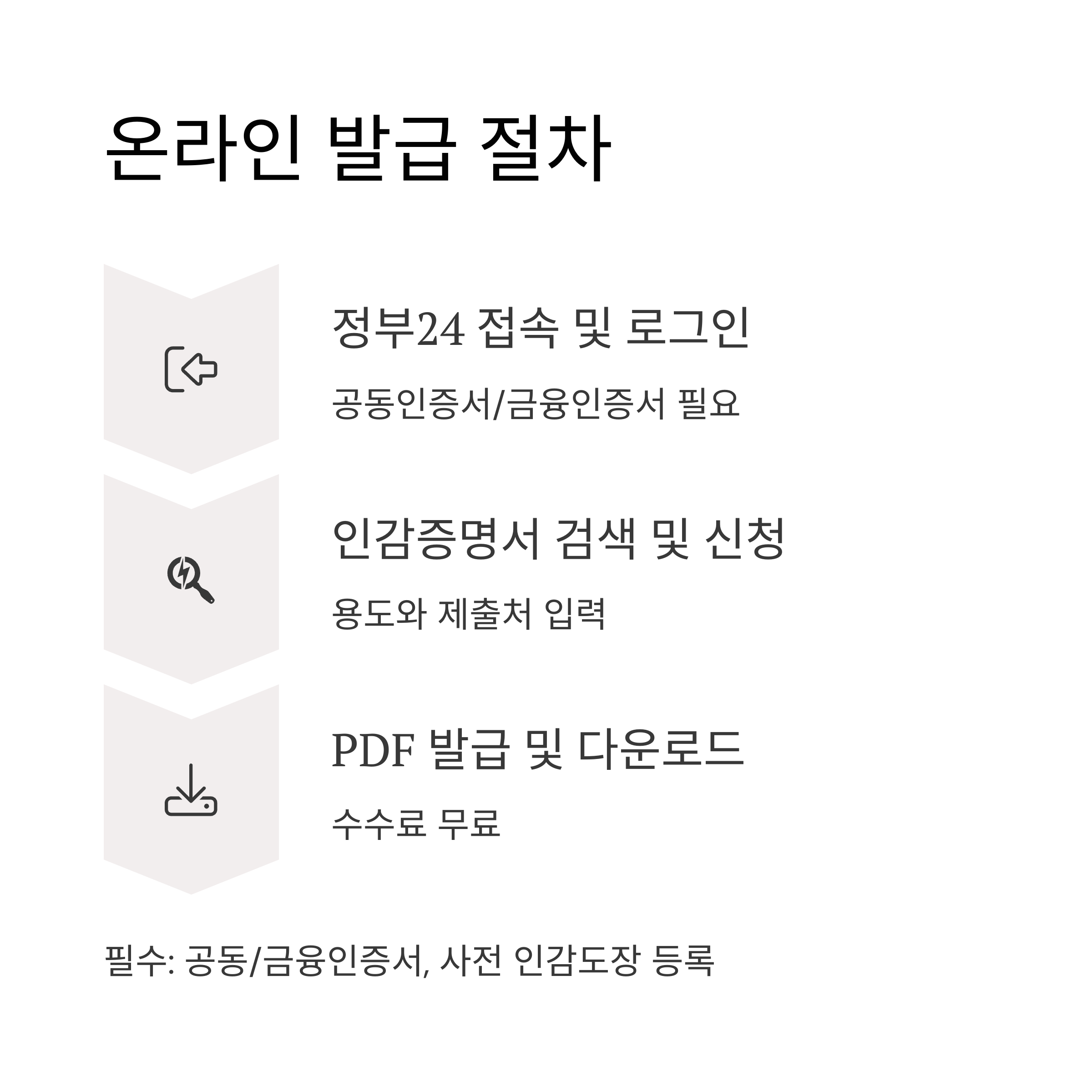 | 온라인 발급 | 공동/금융인증서, 인감도장 등록 | 대리인 불가, 제한적 용도만 가능, PDF 발급 |