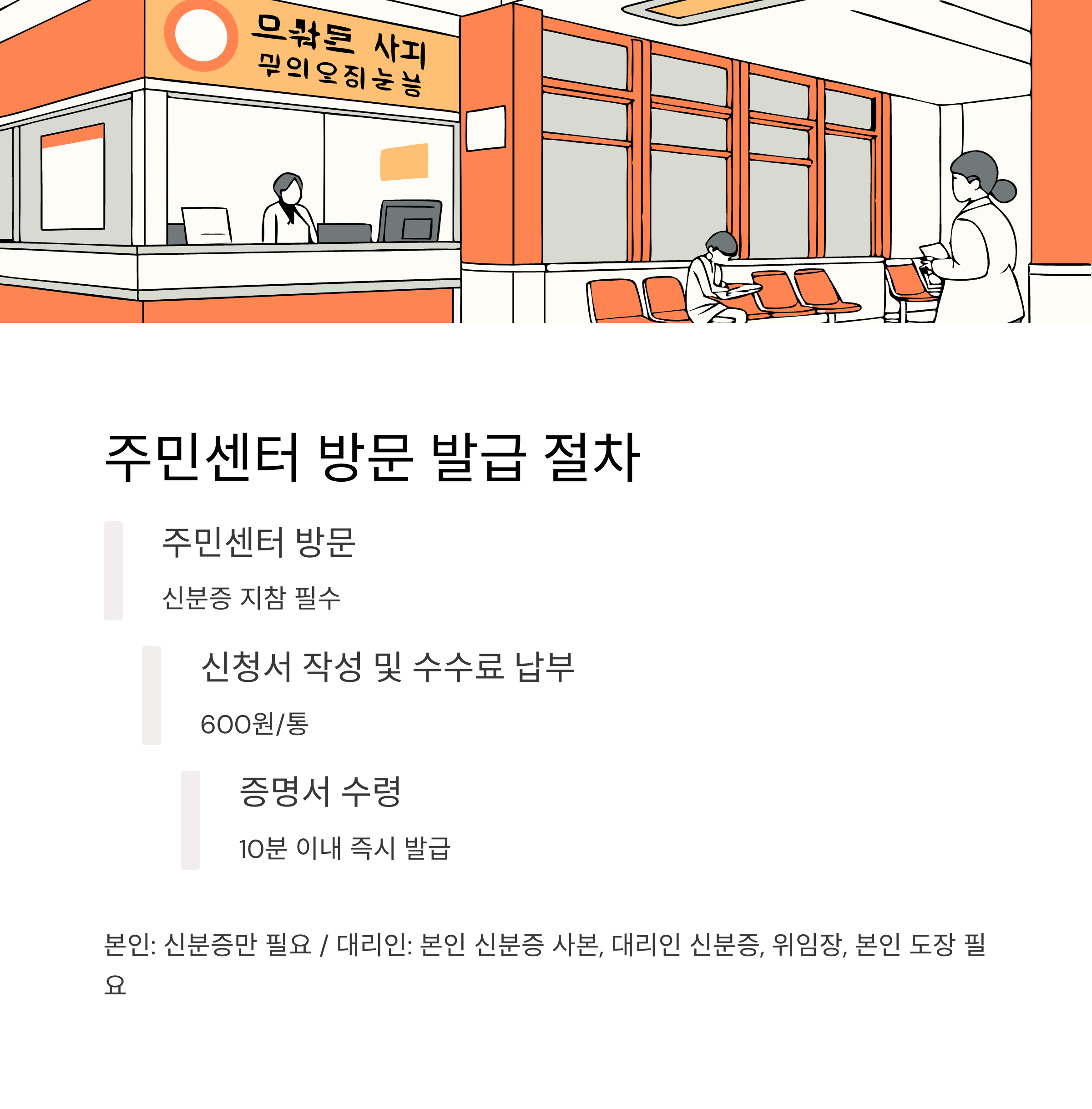 | 오프라인 발급 | 본인: 신분증만, 대리인: 신분증 사본, 대리인 신분증, 위임장, 도장 | 주소지 무관, 대리인 발급 가능, 수수료 600원 |