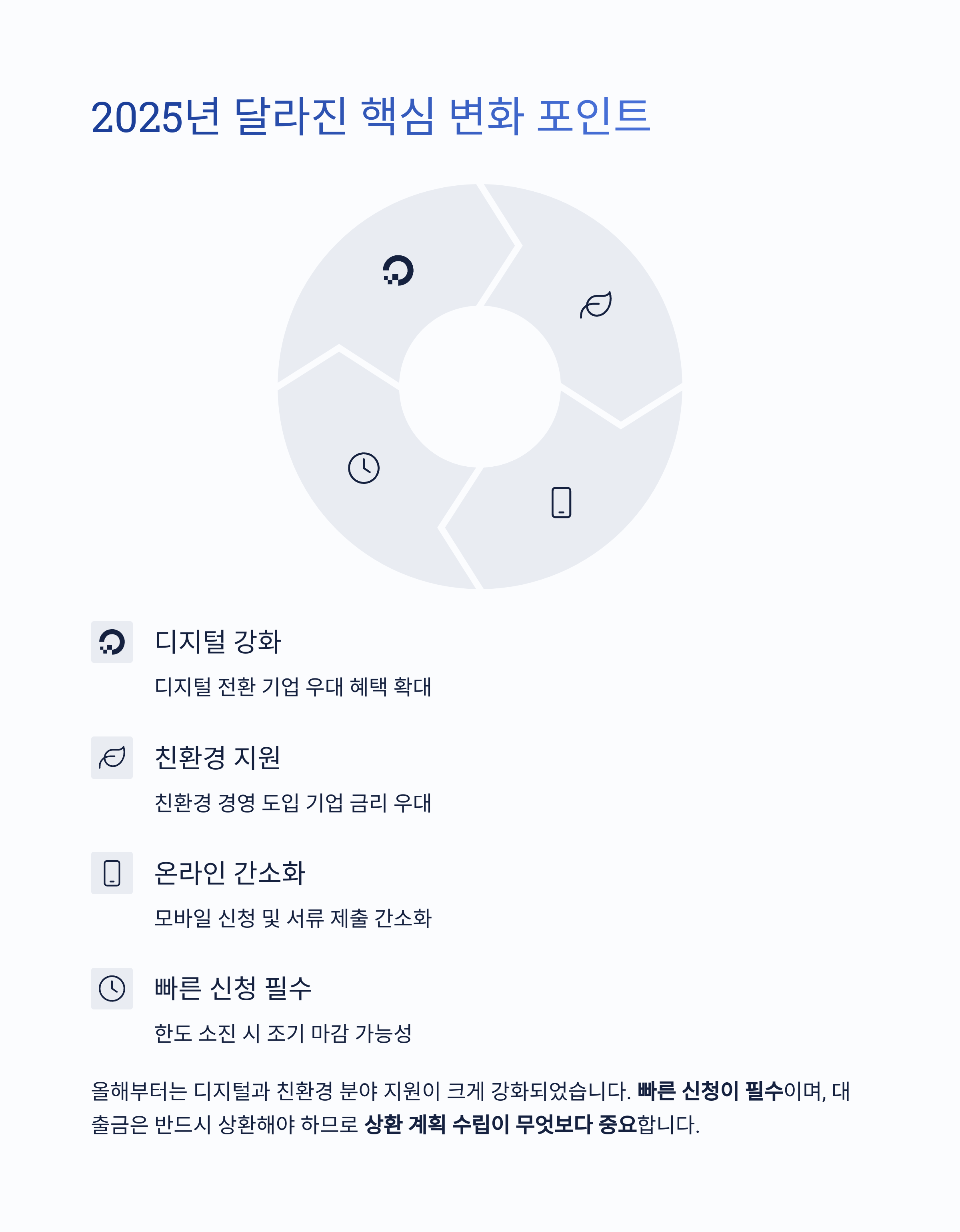 2025년부터는 디지털 전환, 친환경 경영 등 정부 전략 방향에 맞춘 지원이 더욱 확대되었으며, 온라인 간편 신청도 가능해졌습니다.