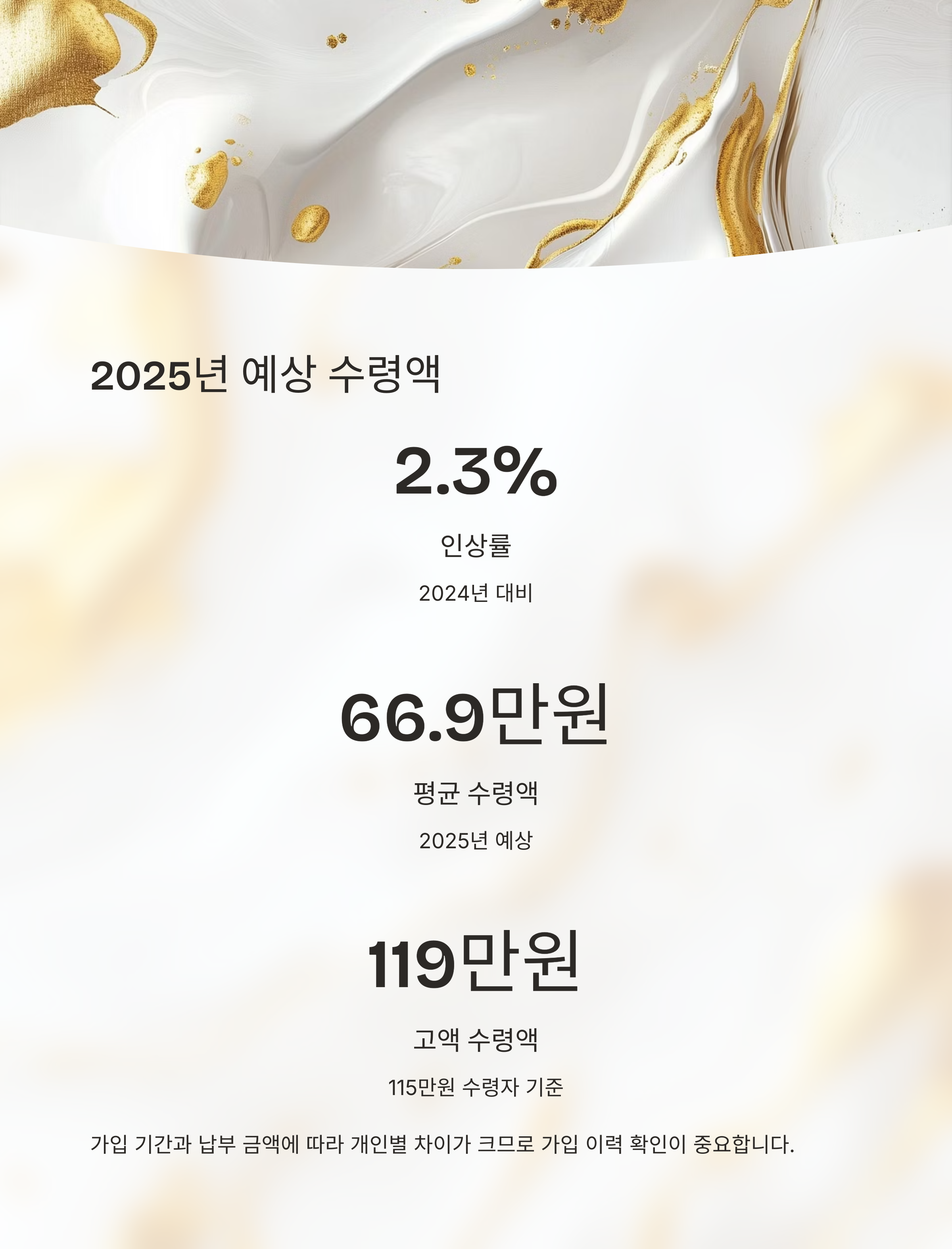 2025년 국민연금 수령액은 2024년 대비 2.3% 인상된 66만 9,523원으로 예상됩니다.
