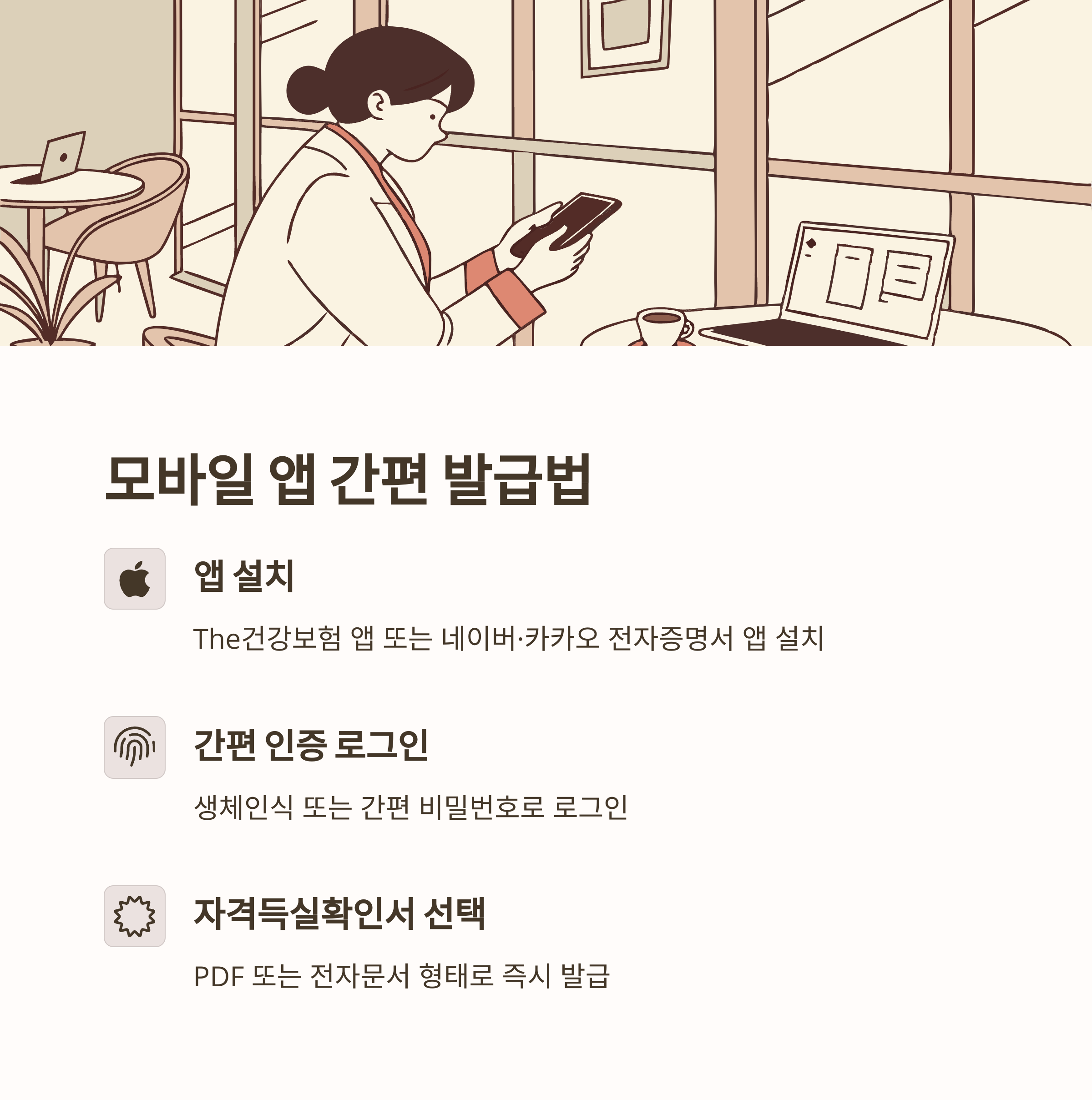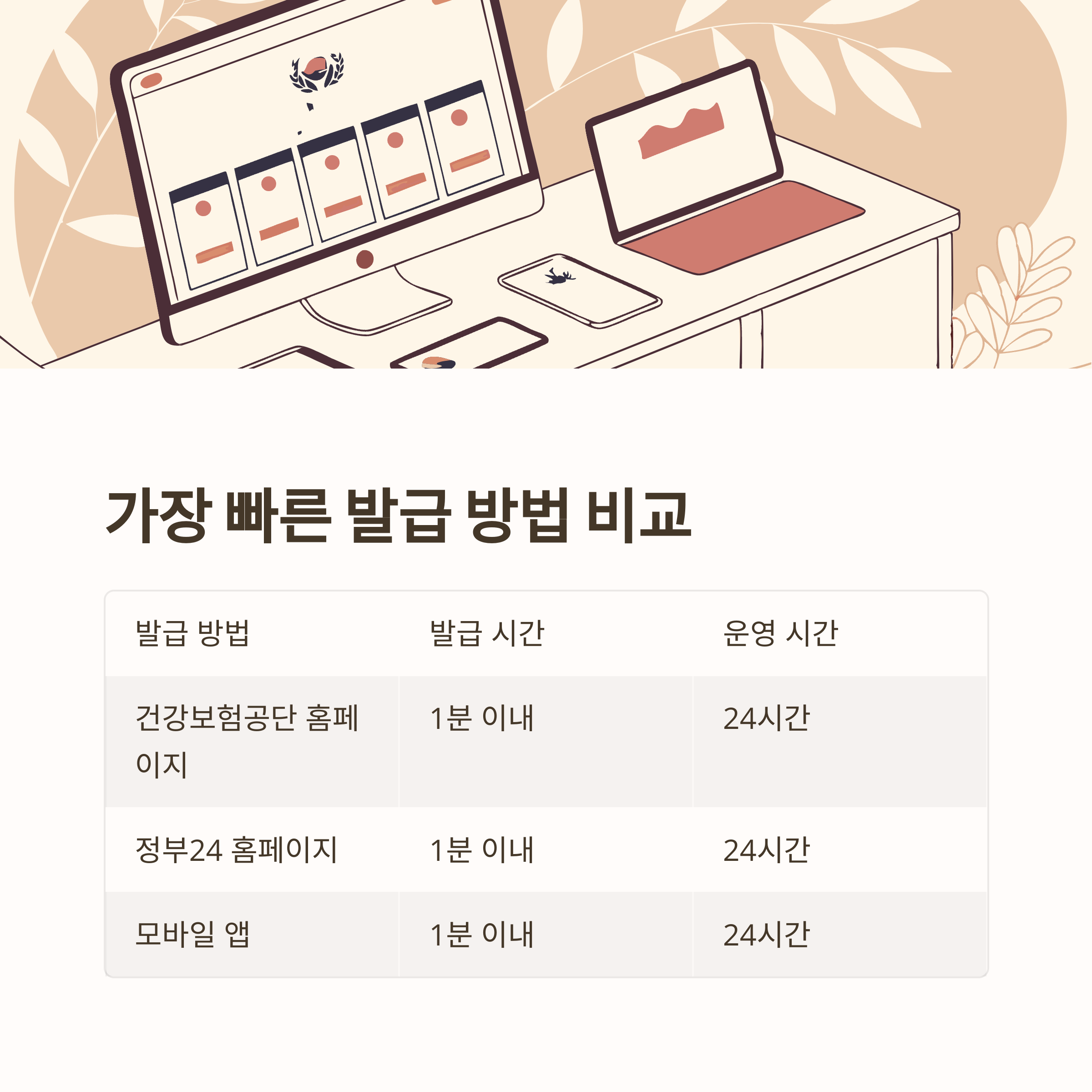 | 모바일 앱 (The건강보험 등) | 간편 인증 | 1분 이내 | PDF, 전자문서 | 24시간 운영 |