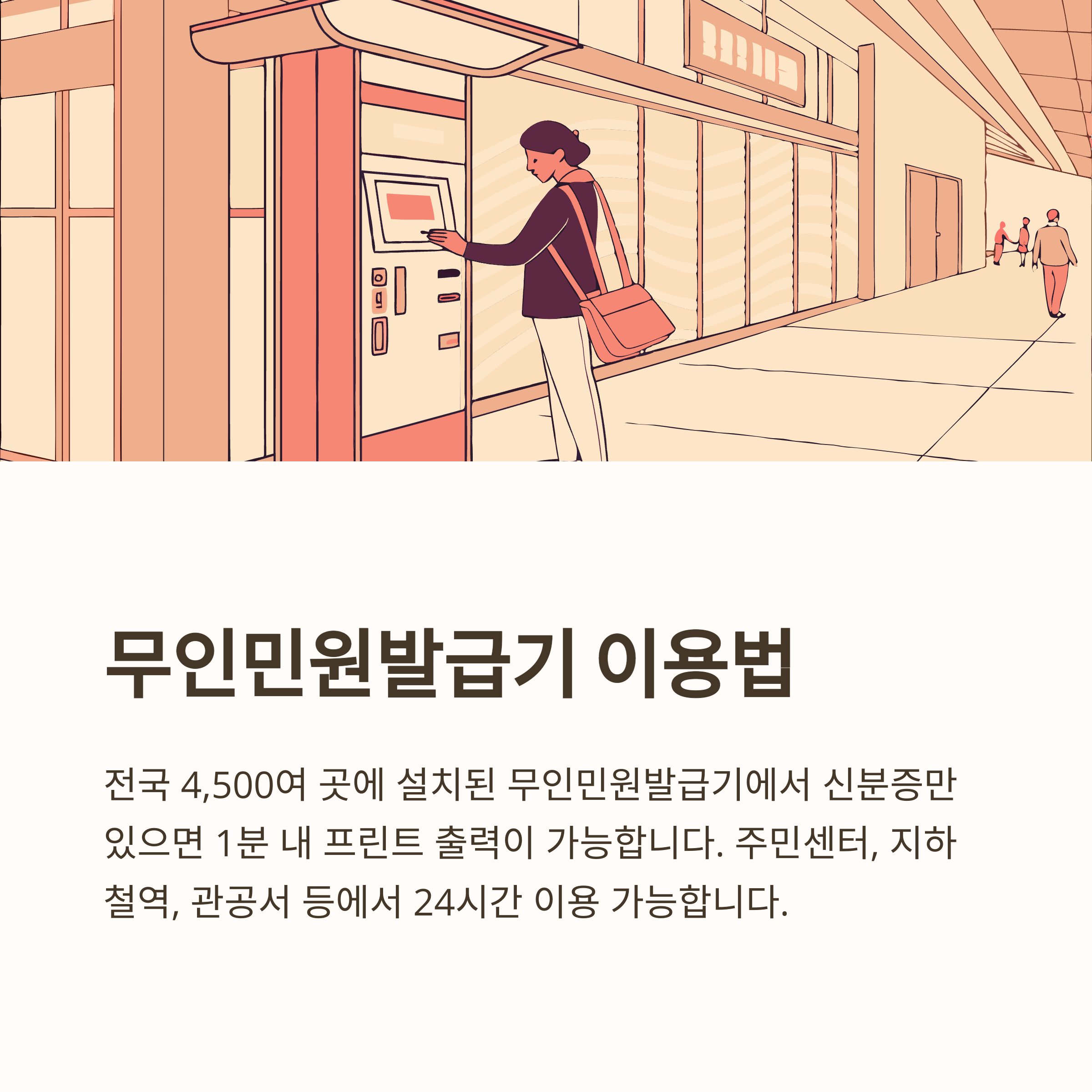 | 무인민원발급기 | 신분증 | 1분 이내 | 프린트 | 24시간 (일부 제한) |