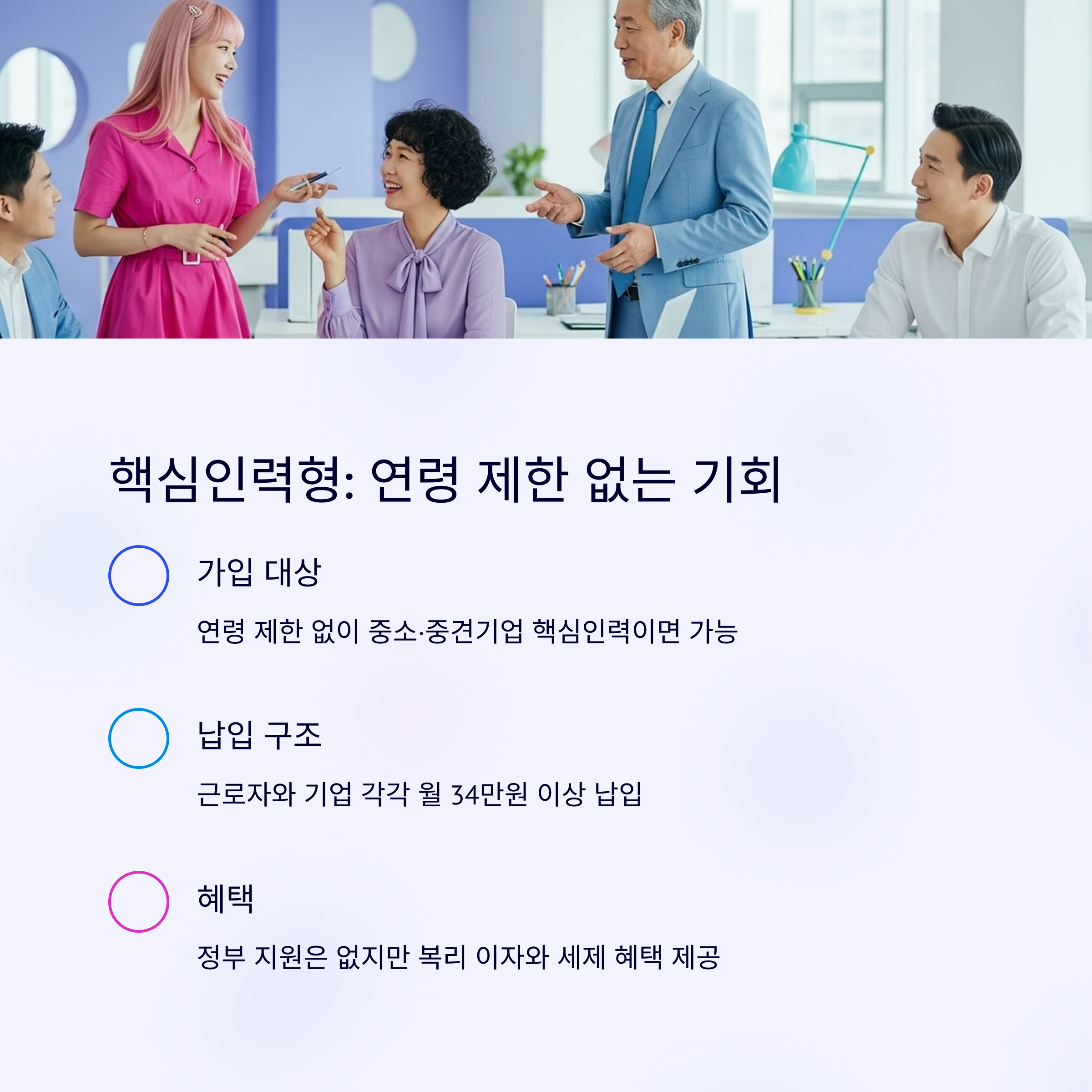 | 핵심인력형 | 연령 무관 핵심인력 | 5년 이상 | 근로자와 기업 월 34만원 이상 납입, 정부 지원 없음 |