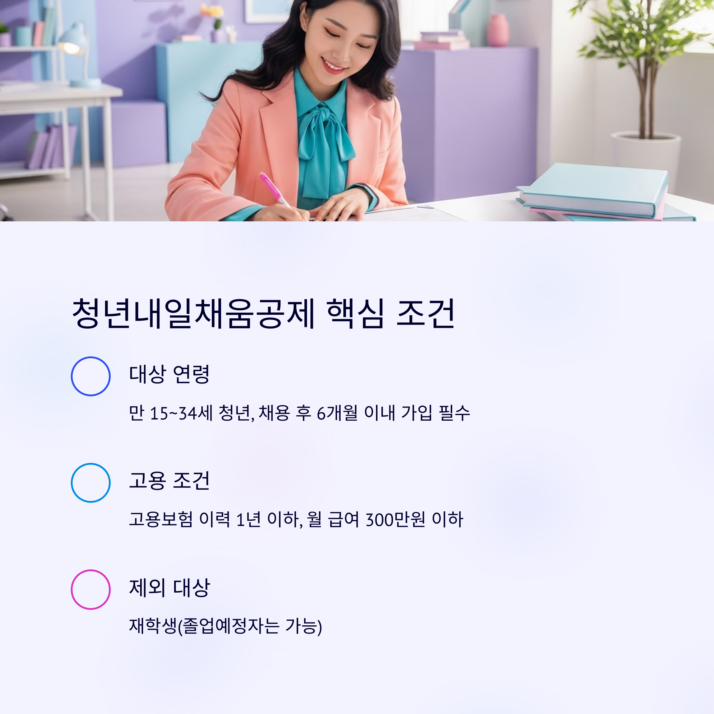 재학생은 제외되며, 졸업 예정자까지는 허용됩니다. 월 급여 총액은 300만원 이하로 제한되며,